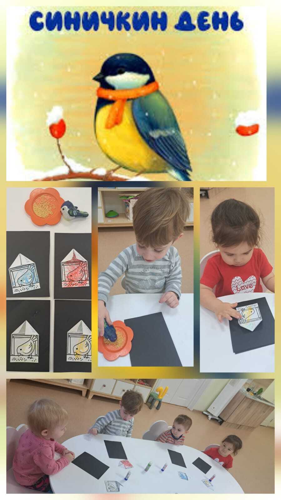 Наши маленькие художники с энтузиазмом создавали домики для синиц в технике аппликации. Используя яркую цветную бумагу, клей и фантазию, ребята клеили уютные гнездышки с окошками, разноцветными крышами. Кто-то добавил сердечки и звездочки, а кто-то — цветы и бабочек, представляя, как синички будут радоваться такому красивому дому! Творчество кипело, и все работы получились неповторимыми.